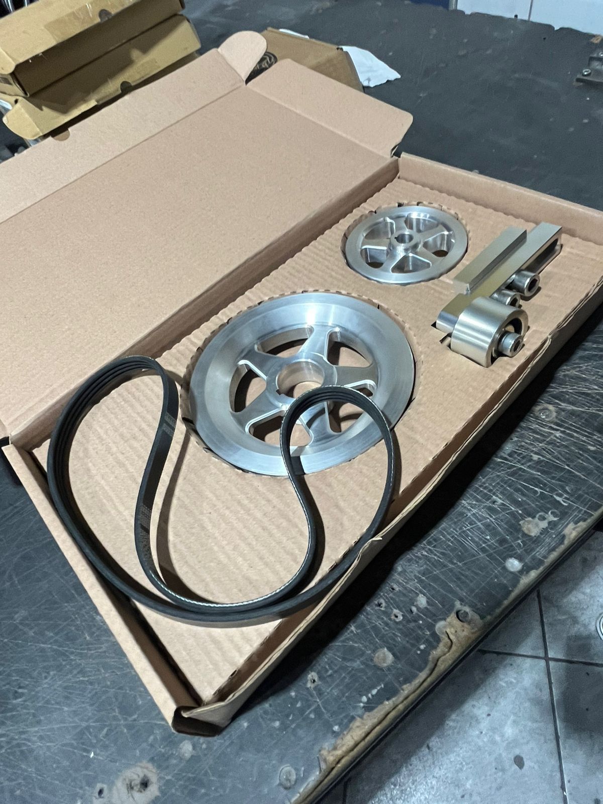 A polia além da estética ela usa um sistema de correia elástica onde deixa a correia sempre esticada e com uma vida útil muitas x maior.